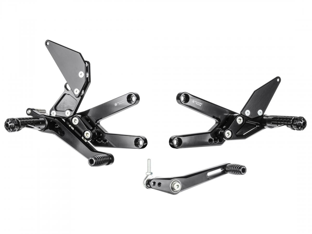 Fabriqué en alliages d’aluminium à haute résistance avec la technologie CNC. Les palettes de Bonamici Racing présentent de nombreuses particularités, parmi lesquelles l'utilisation de roulements à billes pour éliminer complètement les frottements sur les leviers, le ressort pour le retour assisté du levier de frein arrière et la possibilité de réglage dans de nombreuses positions différentes.